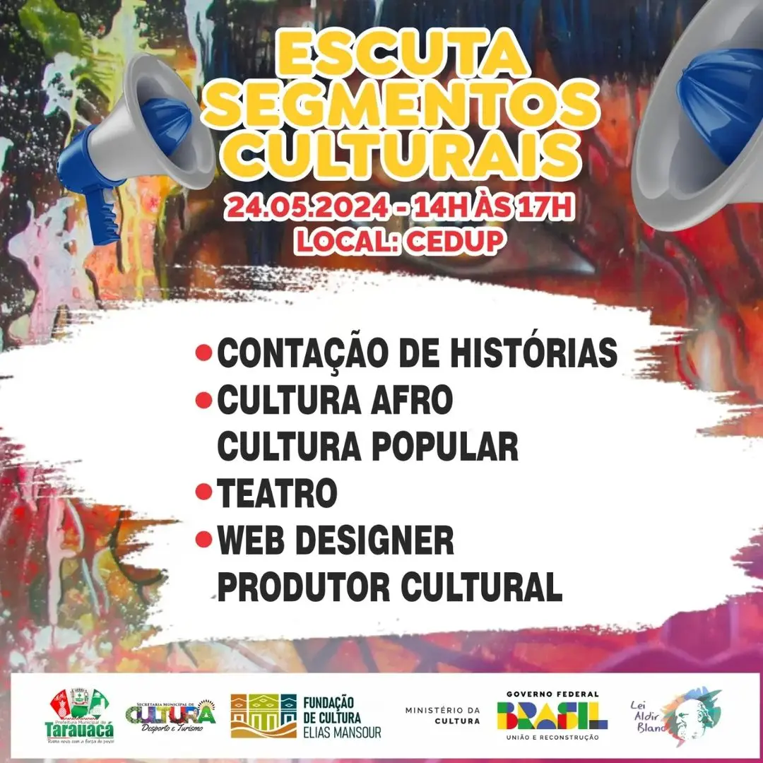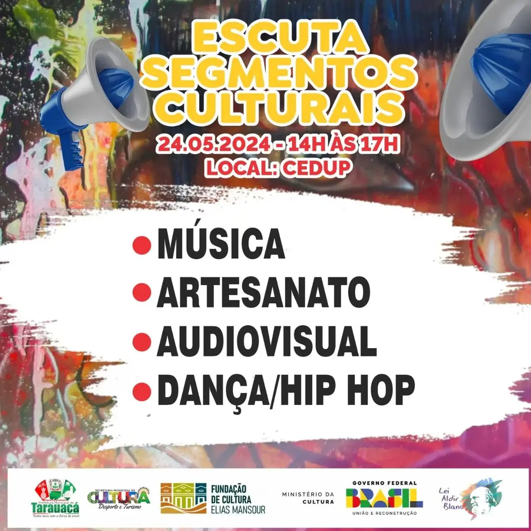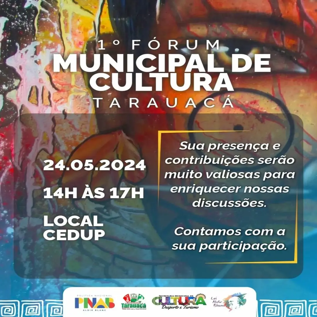 A Prefeitura de Tarauacá, por meio da Secretaria Municipal de Cultura, Desporto e Turismo, realiza o 1° Fórum Municipal de Cultura 2024, focado na Política Nacional Aldir Blanc (PNAB). O evento será realizado no dia 24 de maio, das 14h às 17h, no auditório do Centro de Educação Profissional (Cedup).