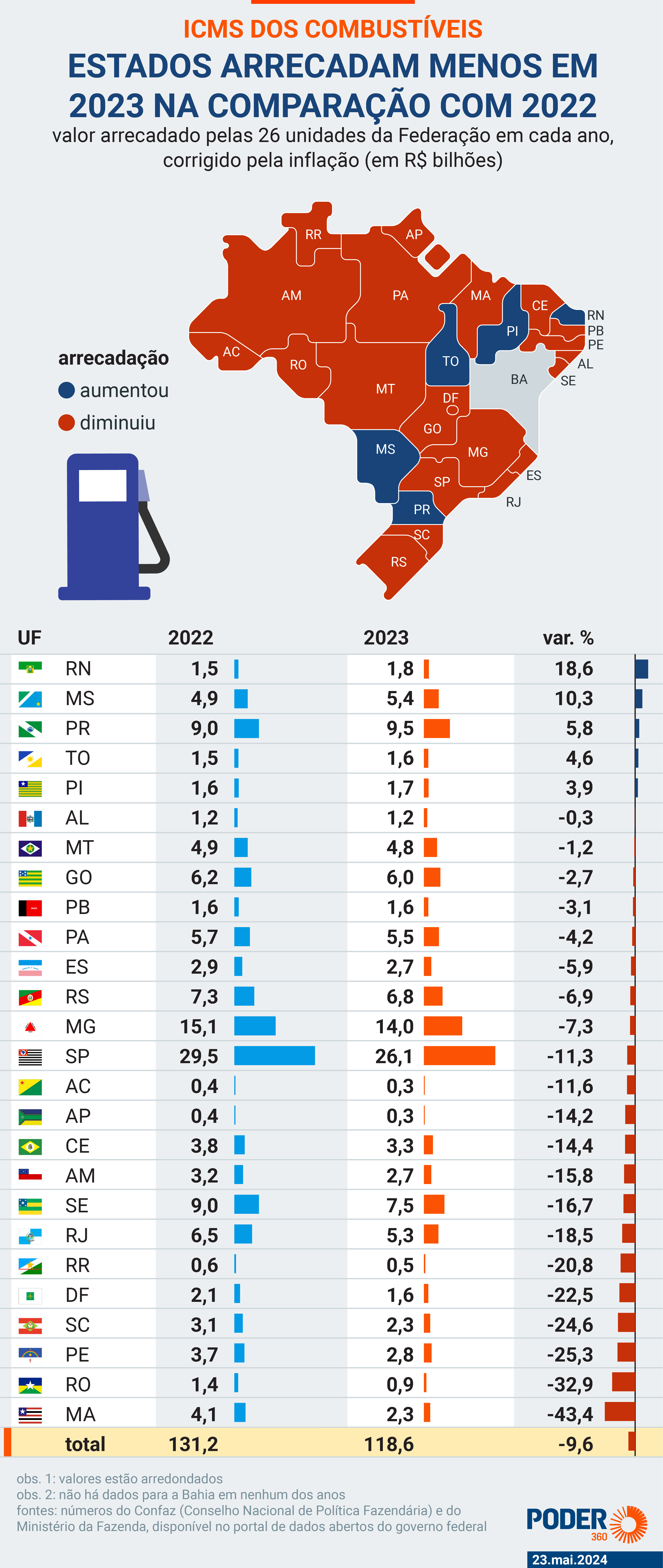 Foram arrecadados R$118,6 bilhões com ICMS sobre combustíveis em todo o país, representando 13,7% da receita tributária estadual. Este percentual é o menor desde 2020.