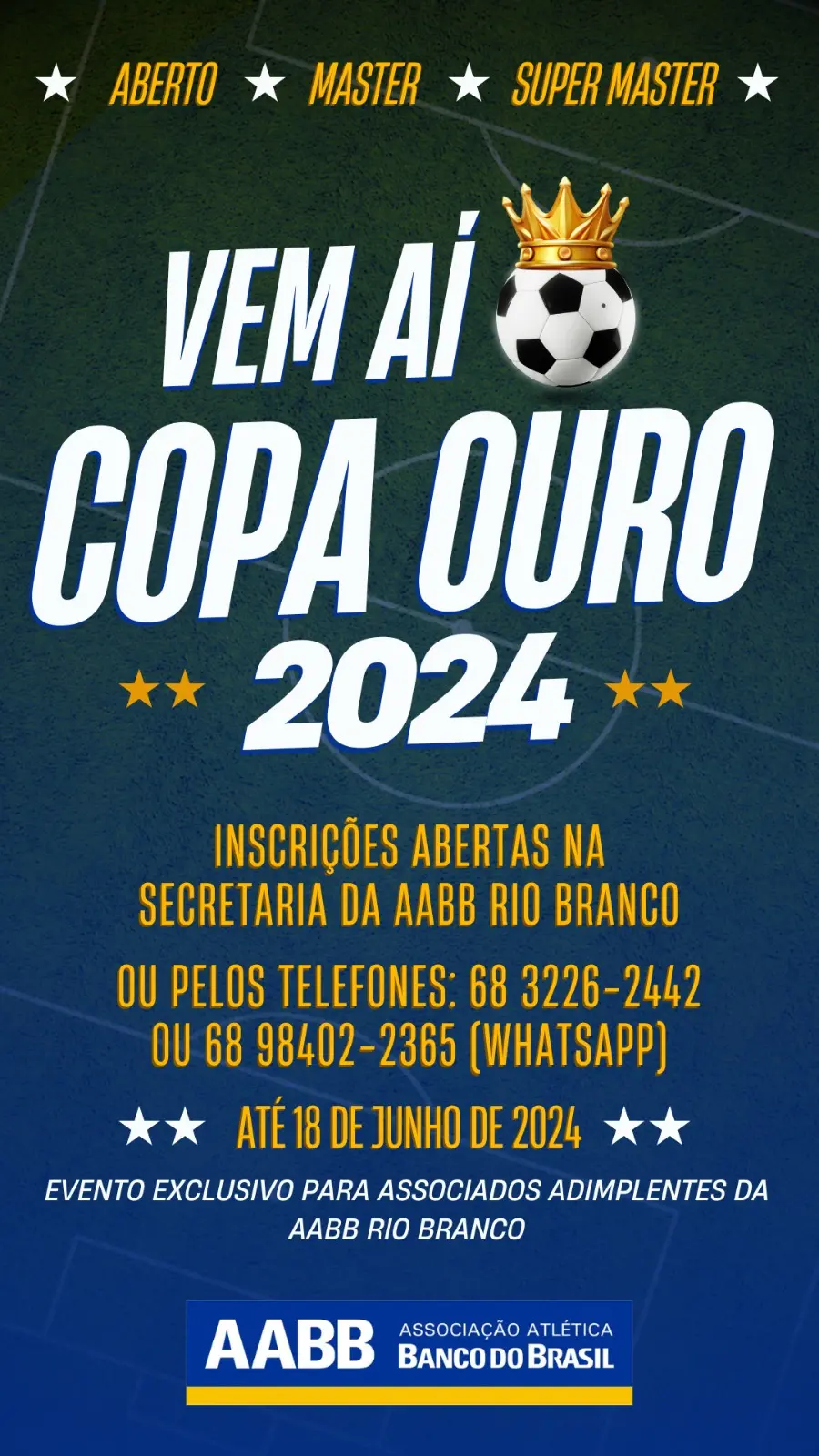 Estão abertas as inscrições para Copa Oura 2024 da AABB. A Copa é exclusivo para associados adimplentes da AABB Rio Branco. As inscrições podem ser realizadas na secretaria da AABB de terça a sexta- feira das 8h as 20h , sábado e domingo das 9h as 16h.