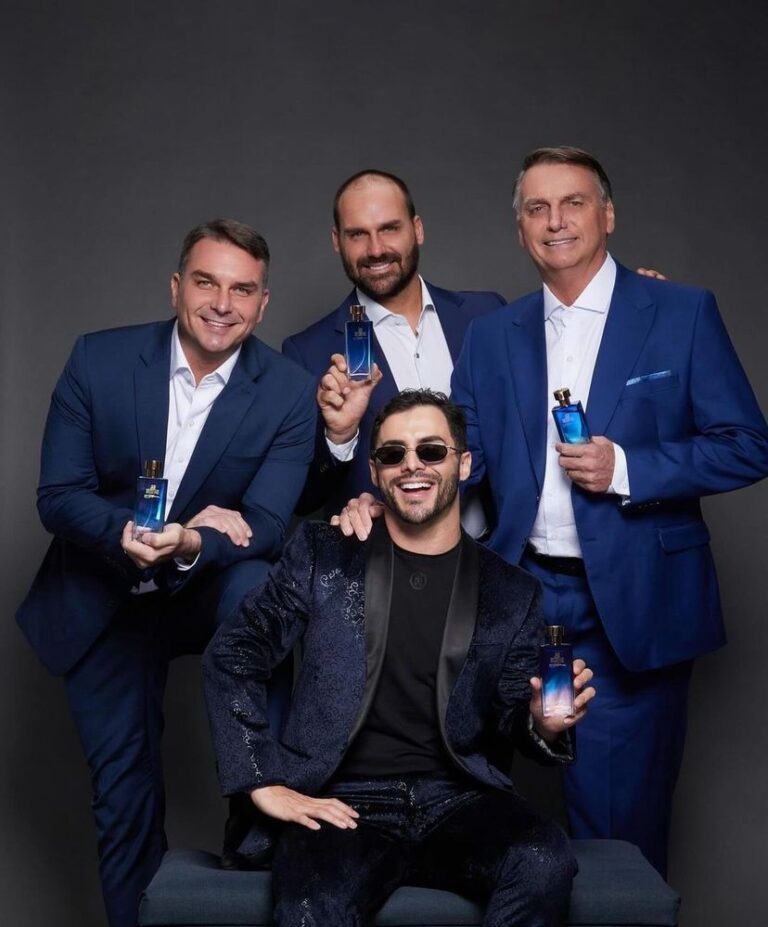 Em um post no Instagram na madrugada desta quinta-feira (30), a ex-primeira dama, Michelle Bolsonaro, divulgou a nova campanha para o perfume “Mito”. O lançamento do produto não é uma novidade, já que Michelle e o empresário e maquiador Agustin Fernandez já estavam divulgando a fragância nas redes sociais. O que surpreendeu os seguidores, contudo, foi a presença dos filhos do ex-presidente Jair Bolsoanro — Eduardo e Flávio — no post.