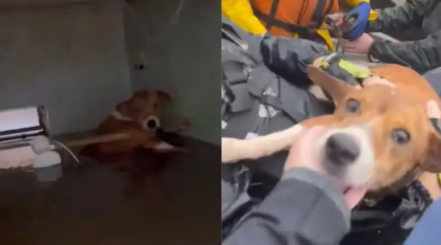 Após o resgate, a equipe comemora o feito e, com carinhos, acalma a cadela, que estava atordoada, após ficar horas apoiada no encanamento para se proteger da enchente.