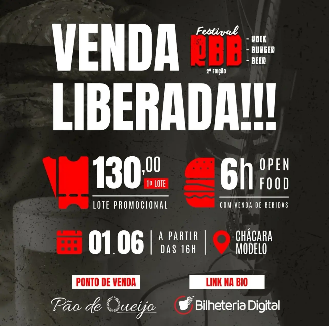 Com vendas presenciais nas conveniências do Pão de queijo e vendas digitais através do link: https://www.bilheteriadigital.com/2o-festival-rbb-rock-burguer-beer-01-de-junho (bilheteria digital com acréscimo de taxa de conveniência) o primeiro lote de ingressos custa 130,00, mas corre que a procura é grande e já já tem virada de lote.