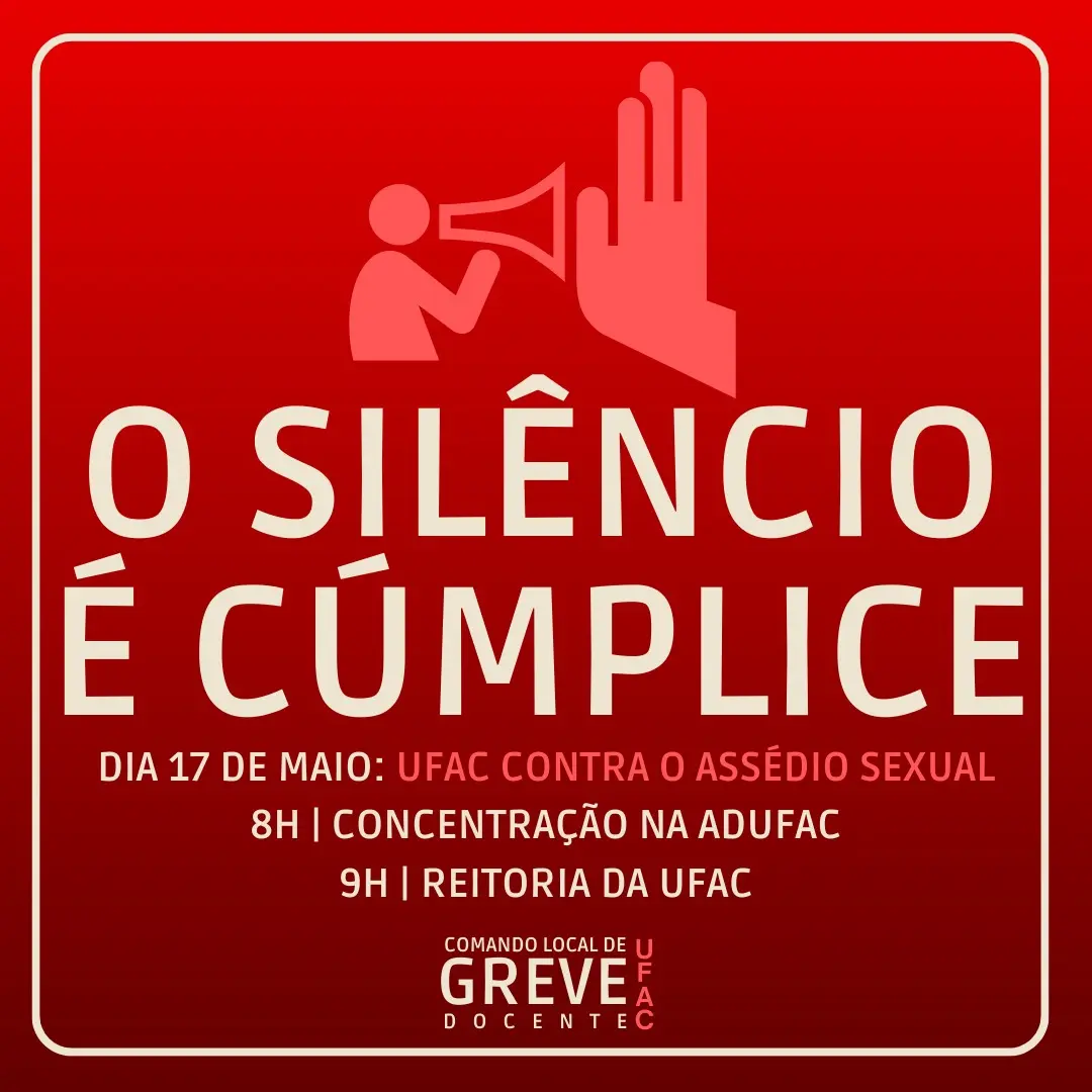 A comunidade acadêmica da Universidade Federal do Acre (UFAC) se mobilizará em um ato público contra o assédio sexual. O movimento, a ser realizado na sexta-feira (17),  iniciando-se às 8h com concentração na Associação de Docentes da UFAC (Adufac), tem como objetivo conscientizar e combater essa prática criminosa que infelizmente ainda persiste em ambientes educacionais.
