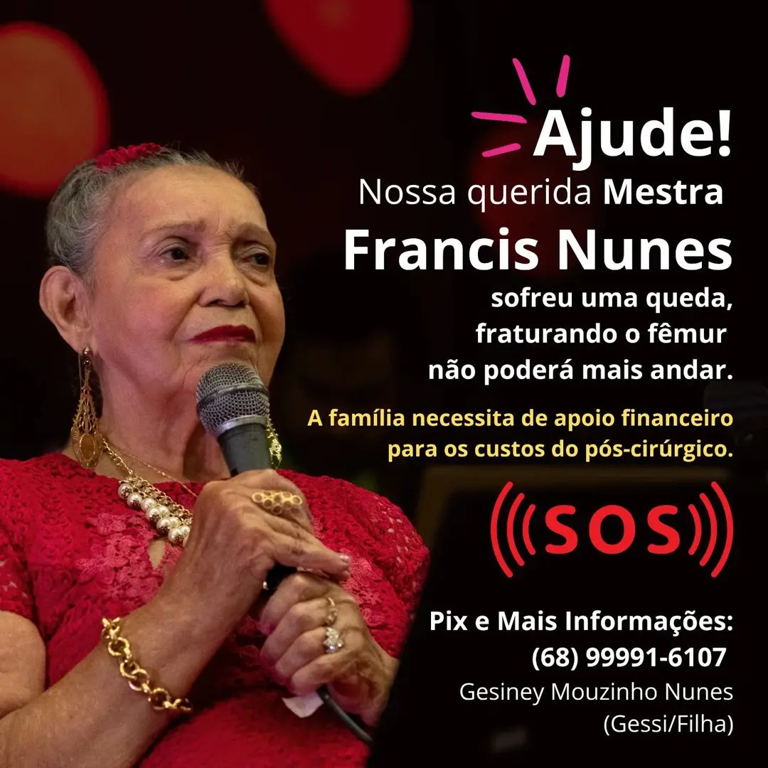 A Mestra Francis Nunes, conhecida por sua dedicação incansável à arte e aos mais necessitados ao longo de sua vida, enfrenta agora um momento de extrema fragilidade devido a um infortúnio. Uma queda em sua residência resultou em uma fratura no fêmur, deixando-a impossibilitada de voltar a andar.