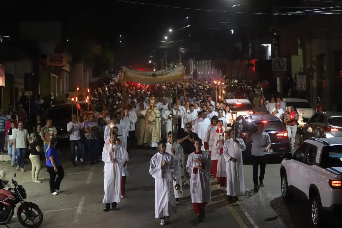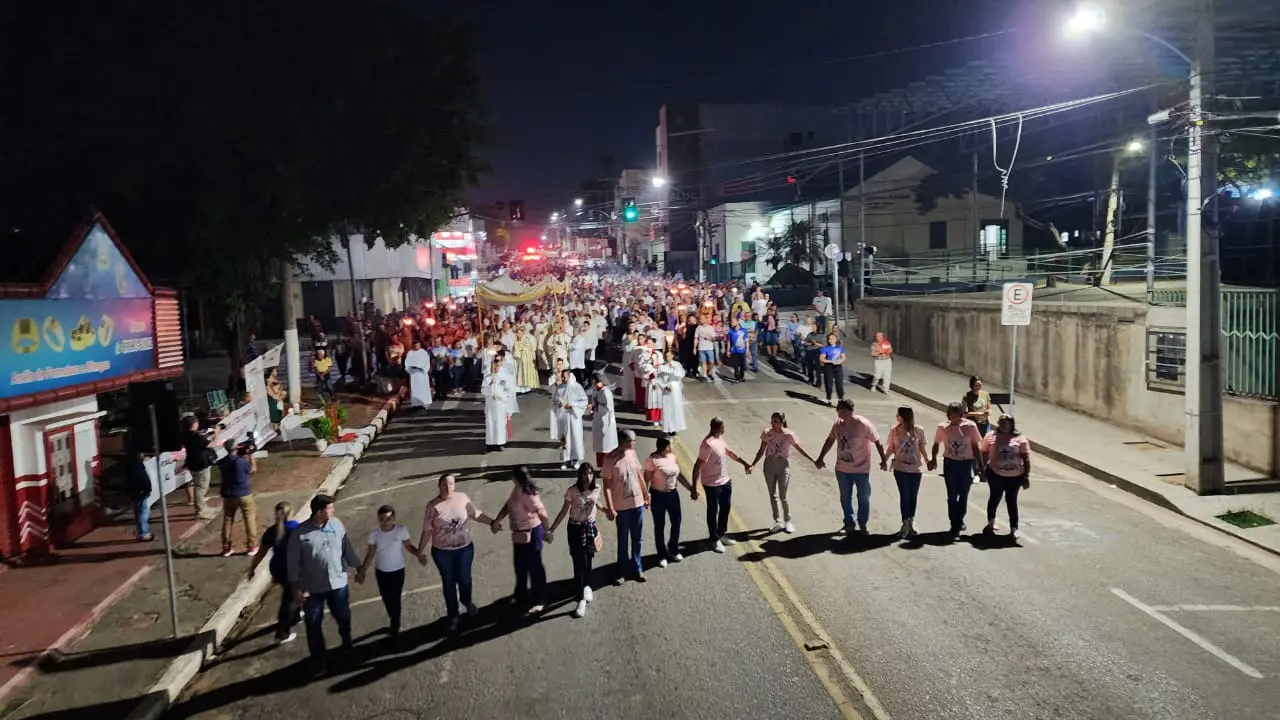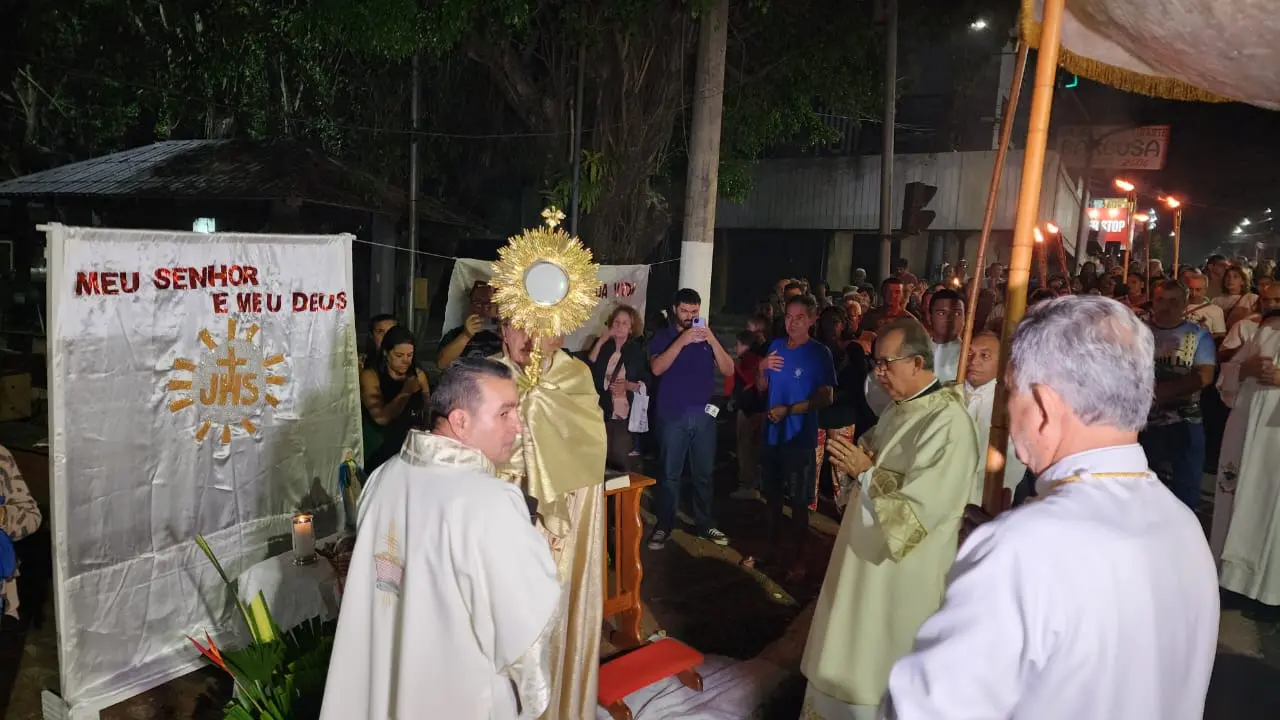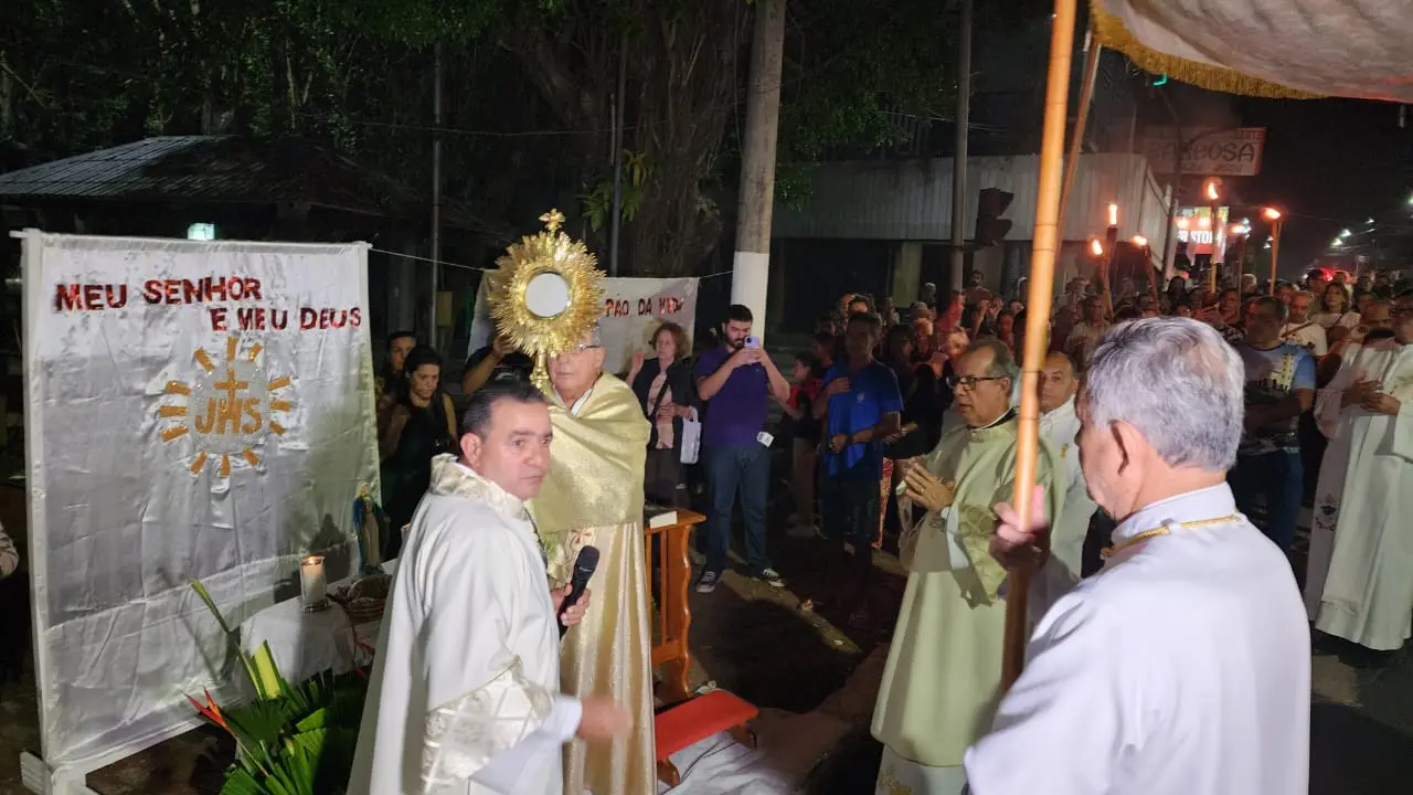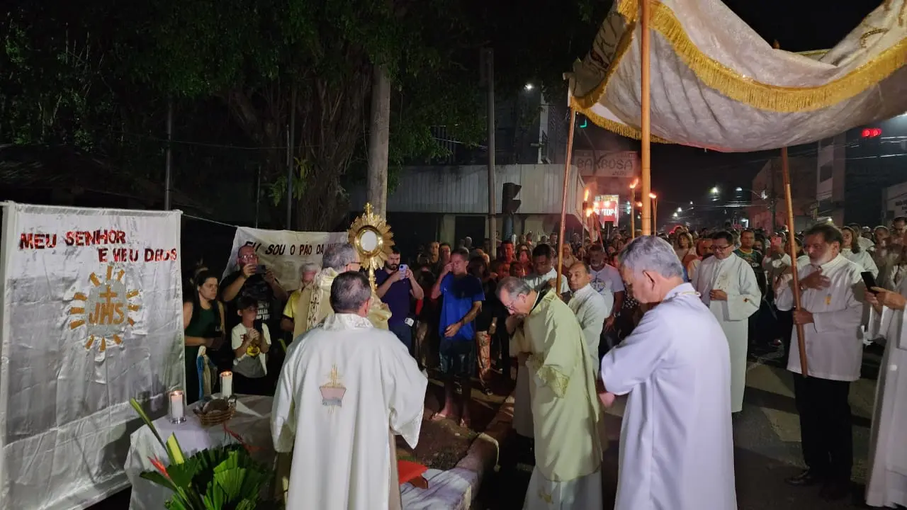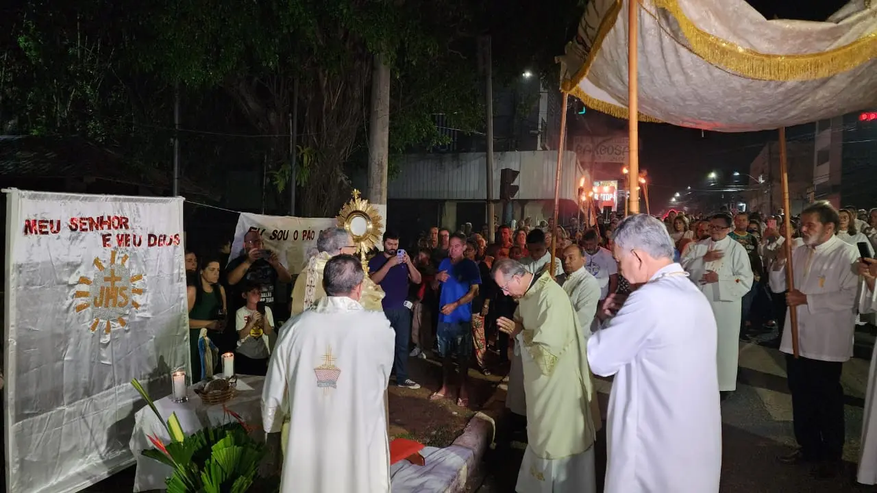 Os mais de 600 fiéis acompanham a procissão de Corpus Christi pelas ruas de Rio Branco na noite desta quinta-feira (30). Com saída da Catedral Nossa Senhora de Nazaré, os católicos seguem em oração e reflexão pelo Centro da capital.