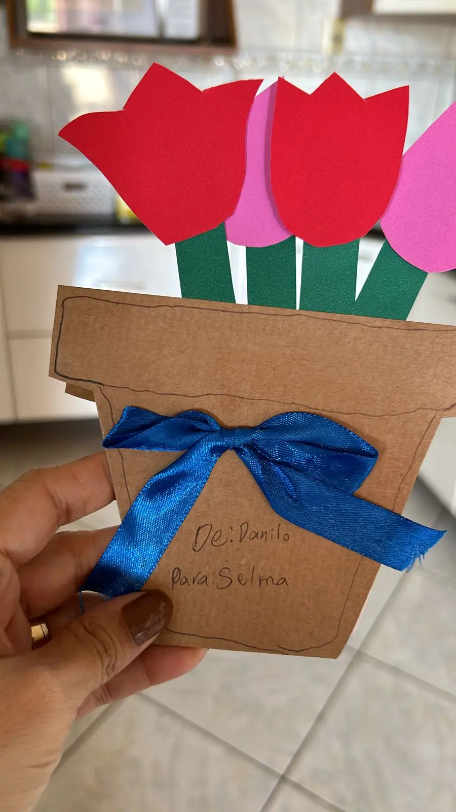 Selma, uma mãe que acompanha o site ContilNet por meio do WhatsApp, compartilhou com a redação uma adorável lembrancinha feita por seu filho Danilo, de apenas 11 anos. O presente, que representava um jarro de flores em E.V.A, trazia uma surpresa especial: a logo do ContilNet desenhada à mão.