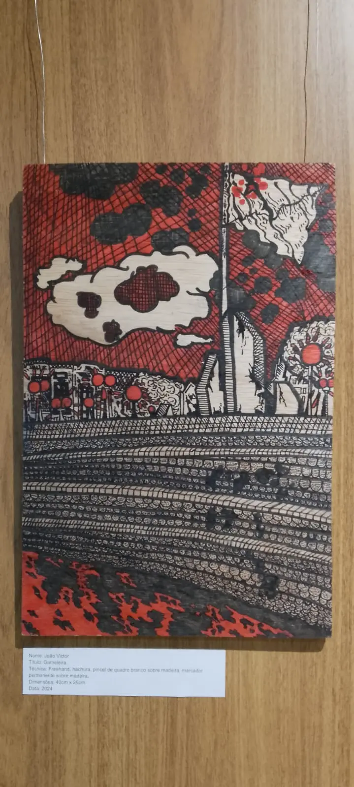 “Eu já usava, já fazia peças em madeiras, como sou mais velho no coletivo, comecei a ensinar os meninos algumas técnicas nesses materiais e também a fazer o estudo pra saber quais materiais usar e em quais “telas”, eles logo tomaram gosto por isso e agora a gente recebe doações de amigos de peças velhas e descartes pra ver se serve como tela alternativa, mas nós também caçamos materiais nas ruas”, explicou ele.