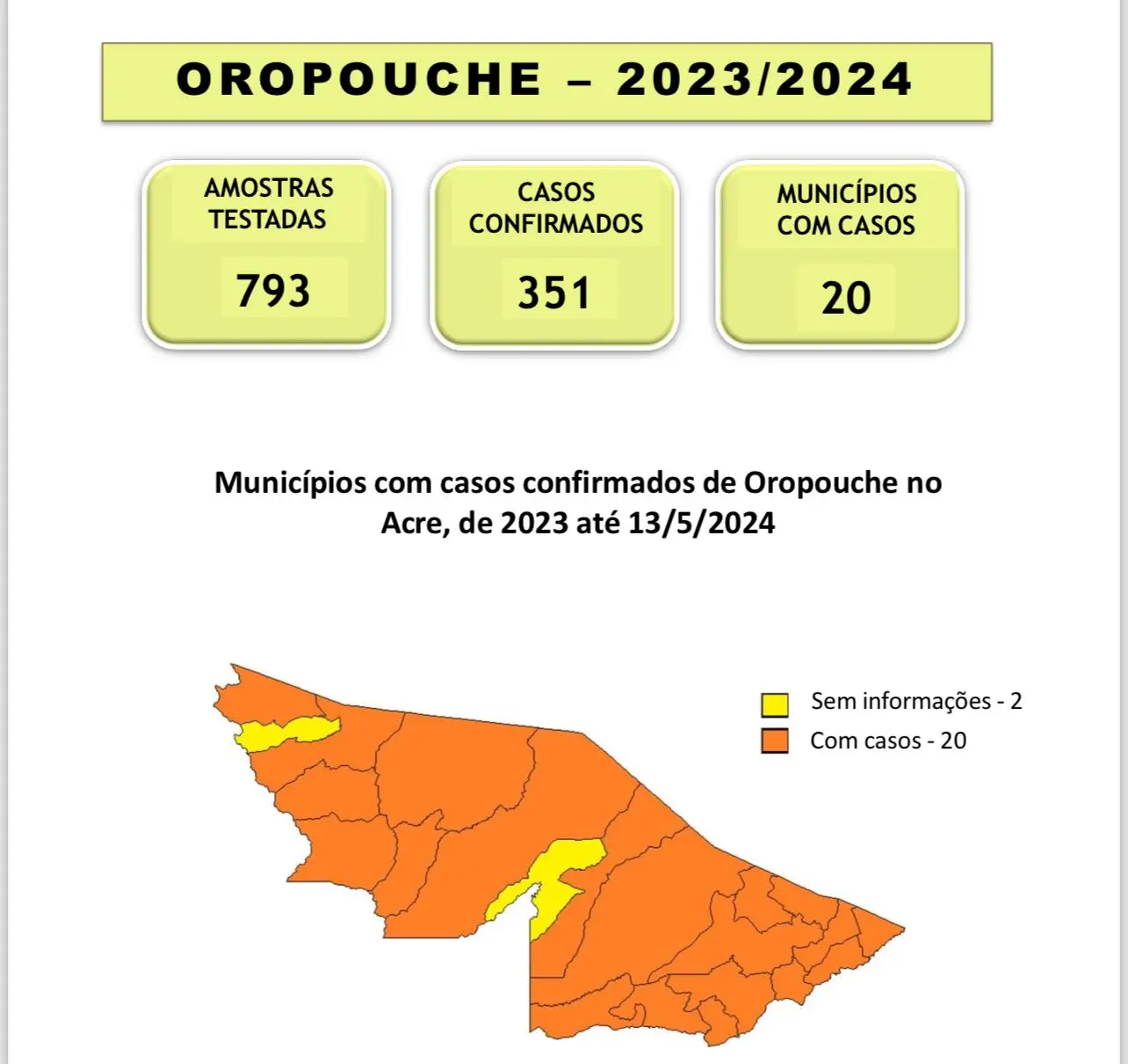 Além disso, dos 22 municípios, 20 já tiveram registros da doença. Apenas Rodrigues Alves e Santa Rosa do Purus não tem casos confirmados