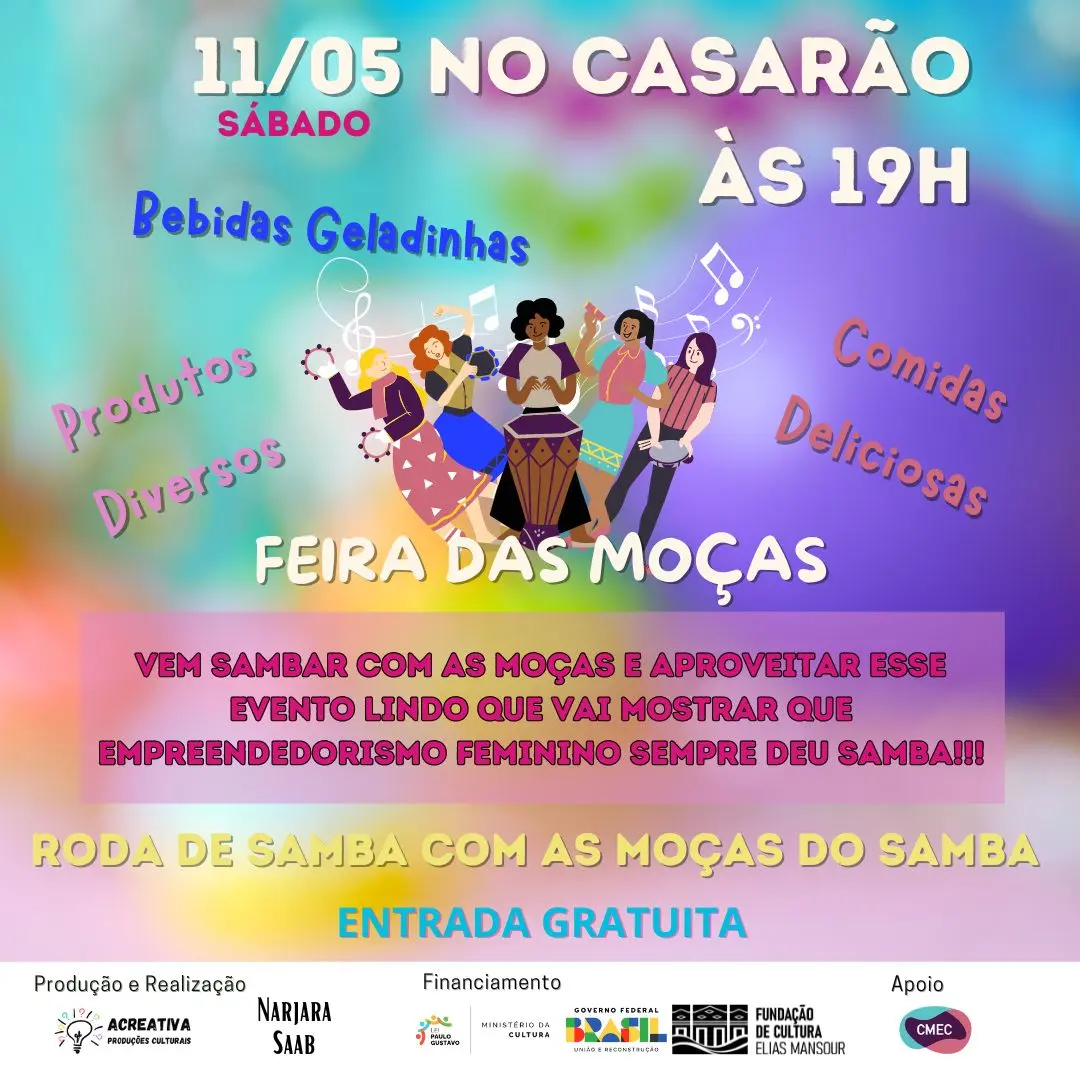 O empreendedorismo feminino e o samba são aliados de longa data e agora, vamos remontar em essência essa realidade realizando rodas de samba no tradicional Espaço Cultural O Casarão rodeadas de mulheres empreendedoras que estarão lá vendendo seus quitutes e seus produtos. Ah! A parte musical também será conduzida por mulheres! As Moças do Samba com um repertório sempre da melhor qualidade