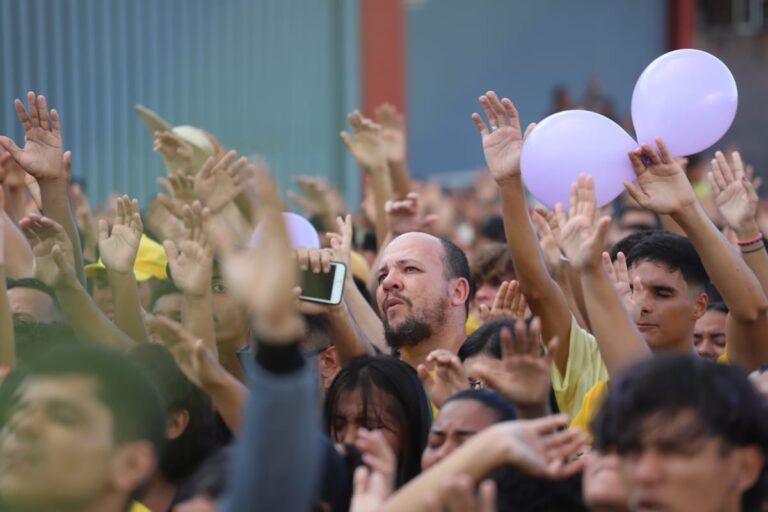 Seguindo o trio elétrico com a banda e pastores, a multidão de fiéis transformou a caminhada em um grande momento de louvor e adoração.