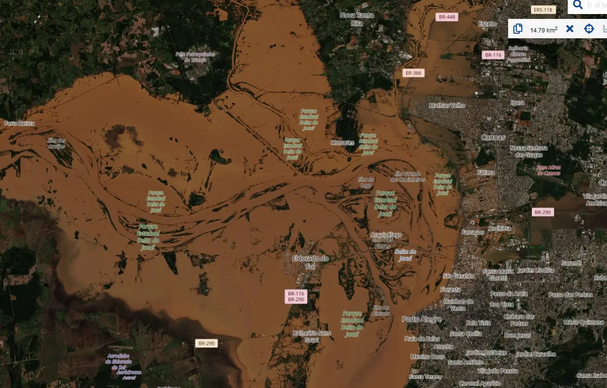O MetSul Meteorologia publicou imagens de satélite da grande enchente que atingiu Porto Alegre após um volume intenso de chuvas nos últimos dias. A imagem mostra como estão cidades banhadas pelos rios Taquari, Caí, Pardo, Jacuí, Gravataí e Sinos que provocaram a cheia do rio Guaíba na capital gaúcha.