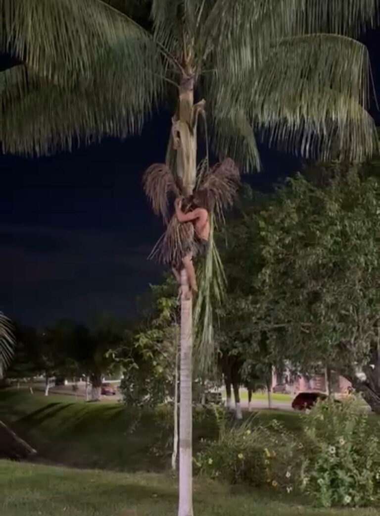 O incidente ocorreu em um momento em que a cidade já estava na escuridão da noite, e populares, ao passarem pelo local, avistaram o homem escalando o coqueiro em busca de alimento.
