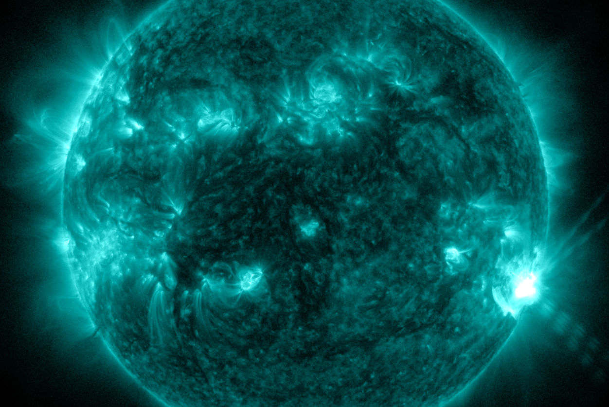 O Observatório de Dinâmica Solar da NASA capturou esta imagem de uma explosão solar – como visto no flash brilhante no canto inferior direito/Foto: Nasa
