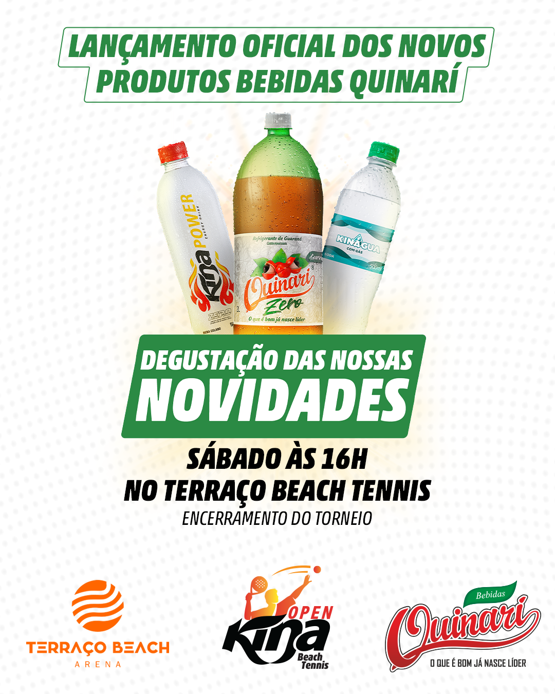O campeonato que será chancelado pela Federação de Beach Tennis BT 500, vem para marcar o lançamento oficial dos 3 novos produtos da Bebidas Quinarí: Guaraná Quinari Zero (de 2 litros) Kina Power Zero (500 ml) e Kinágua com gás. Os produtos estarão disponíveis para degustação no campeonato, permitindo que o público conheça e saboreie essas novidades.