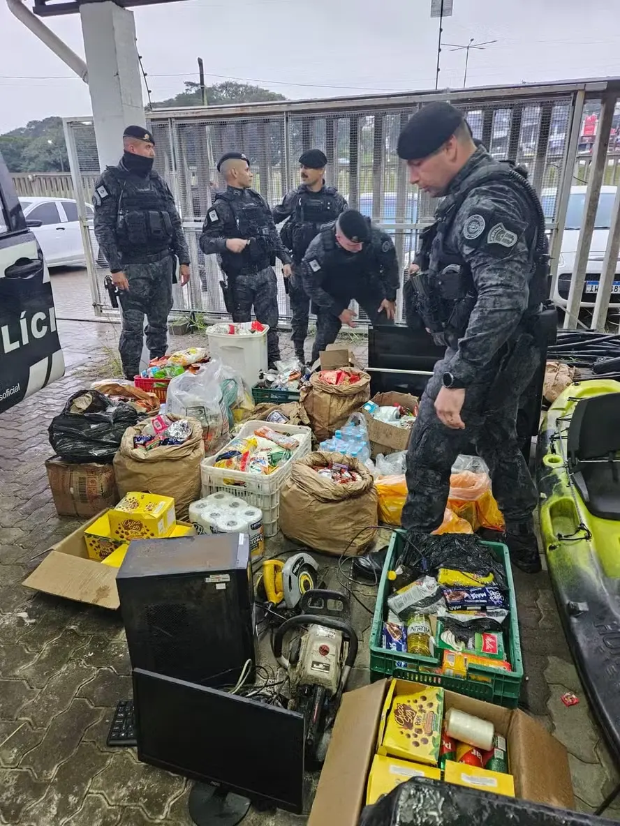 Foi preciso dois caminhões do Exército que comportam oito toneladas e três viaturas da Brigada Militar para recolher todo o material. Havia dezenas de televisores, notebooks, fardos de cerveja, vestuário, barras de chocolate, uma arma e um colete balístico, entre outros itens.