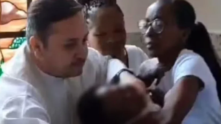 Padre puxa bebê durante batismo e família presta queixa à polícia