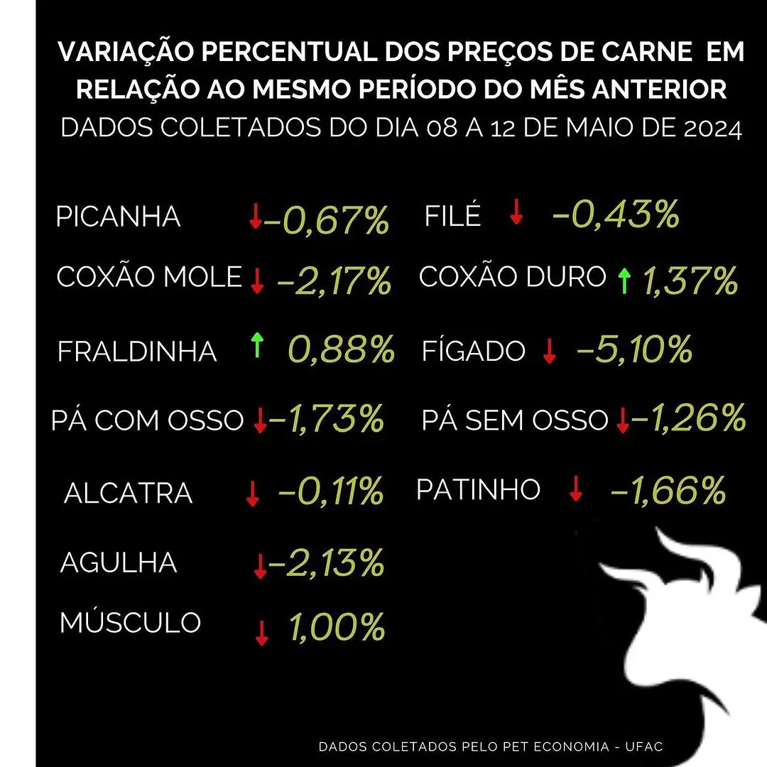 Todos os outros cortes de carne observados também tiveram redução, com exceção dos citados anteriormente com alta, sendo eles: picanha, filé, pá com osso, pá sem osso, alcatra, patinho, agulha e músculo.