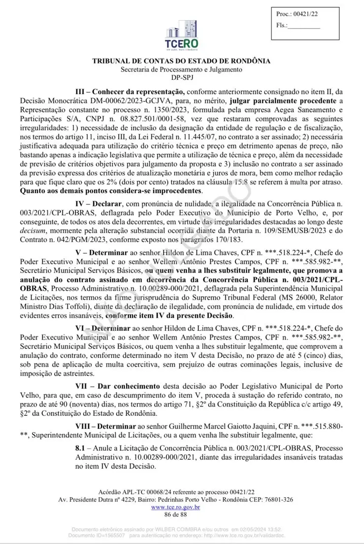 “Não se pode admitir que a postura contraditória do Tribunal de Contas do Estado de Rondônia prevaleça frente a melhoria iminente e definitiva na prestação dos serviços e ao bem-estar dos cidadãos de Porto Velho, bem como à robusta economia que a contratação trará ao Município (ainda mais se considerado o alto esforço e investimento que o Município de Porto Velho empregou para estruturar um projeto de excelência, chancelado por uma das mais renomadas instituições do país)”.
