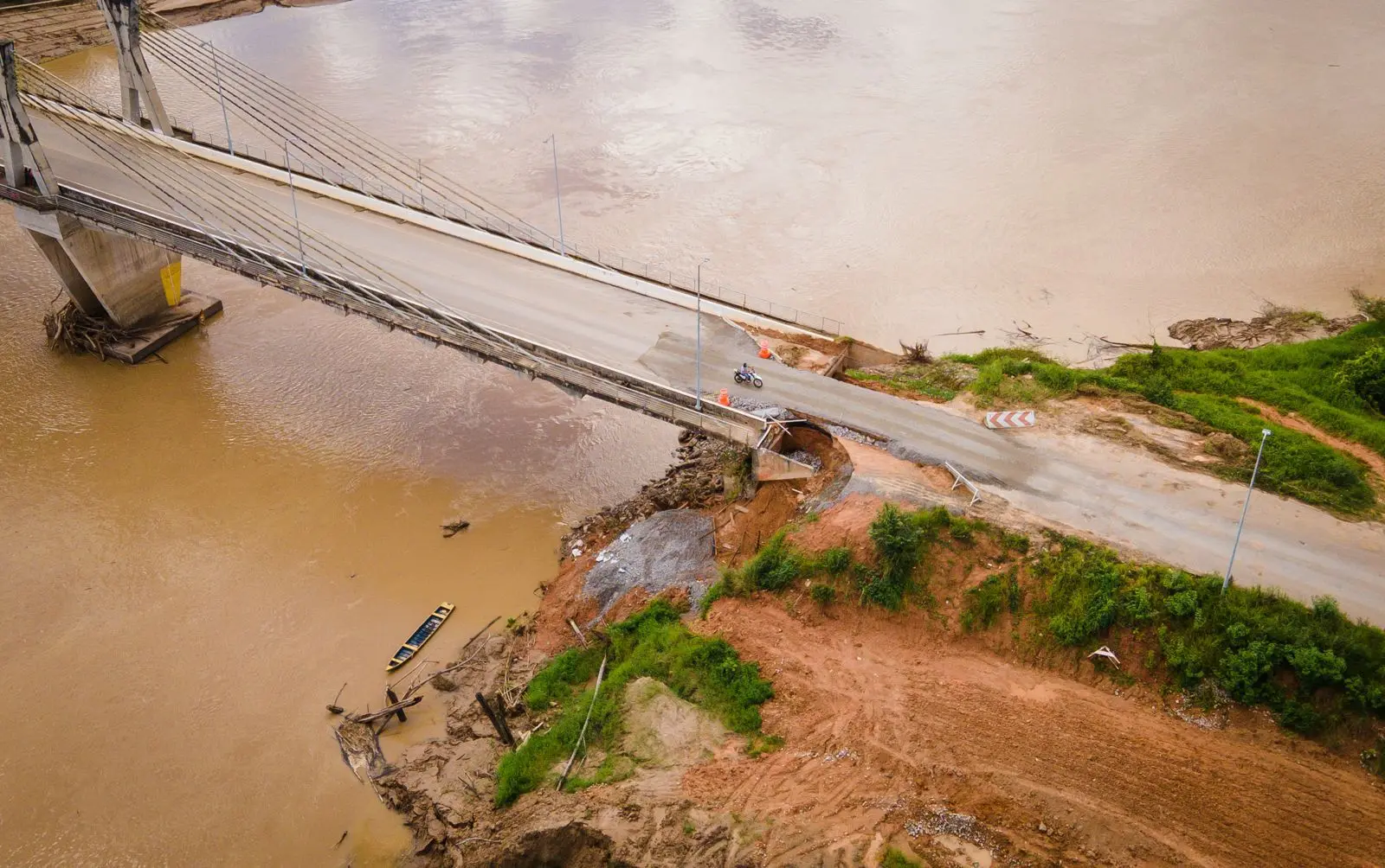 Adicionalmente, há uma obra emergencial em andamento para expandir a ponte sobre o rio Tarauacá para aumentar sua durabilidade frente aos problemas recorrentes de erosão. Segundo Araújo, a estratégia emergencial adotada envolveu a instalação de vigas e perfis metálicos na cabeceira da ponte. Esses componentes funcionam como uma emenda, reforçando a estrutura existente. “Nós colocamos ali, na cabeceira da ponte, vigas, perfis metálicos, como uma emenda sobre a ponte. Com isso demos mais segurança, cobrimos com material e isso aí vai dar uma segurança. Quem passar já sabe que aquilo ali vai ficar robusto e não vai dar problema”, explicou o superintendente.
