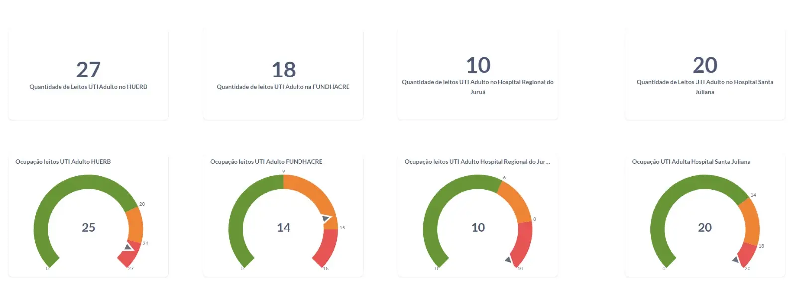 Os dados, atualizados nesta terça-feira, às 14h, mostram que há 27 leitos de UTI no Pronto-Socorro, 18 leitos na Fundação Hospitalar do Acre (Fundhacre), 20 leitos no Hospital Santa Juliana e 10 leitos no Hospital Regional do Juruá, destes quatro estão disponíveis na Fundhacre e dois na unidade do Pronto-Socorro.