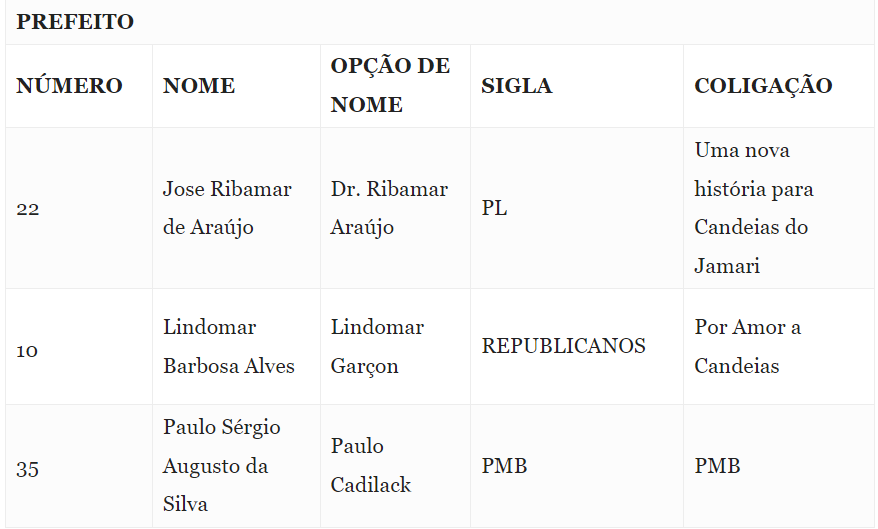 Assim, se deferidos pelo juízo da 21ª Zona Eleitoral, o eleitorado de Candeias do Jamari deverá escolher seu novo prefeito e vice-prefeito, dentre os seguintes candidatos: