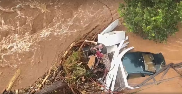 No momento da ação é possível ver que o casal está em cima de um carro coberto por galhos de árvores que acabaram se prendendo no veículo por causa dos temporais no estado.