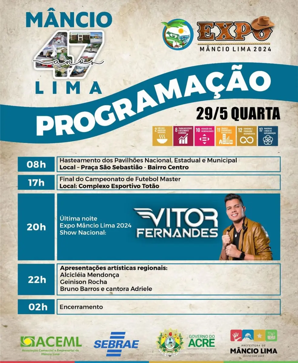 A Expo Mâncio Lima, primeira feira agropecuária do município, encerra suas atividades nesta quarta-feira, 29 de maio, com um espetáculo aguardado por muitos. O cantor Vitor Fernandes é a grande atração da noite, prometendo agitar o público no complexo esportivo Totão. O show está previsto para começar às 20 horas e marca também as celebrações do 47º aniversário do município.