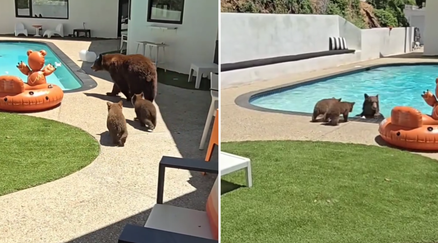 Um morador da Califórnia (EUA) registrou o momento em que uma mamãe ursa mostra aos seus dois filhotes como dar um mergulho na piscina.