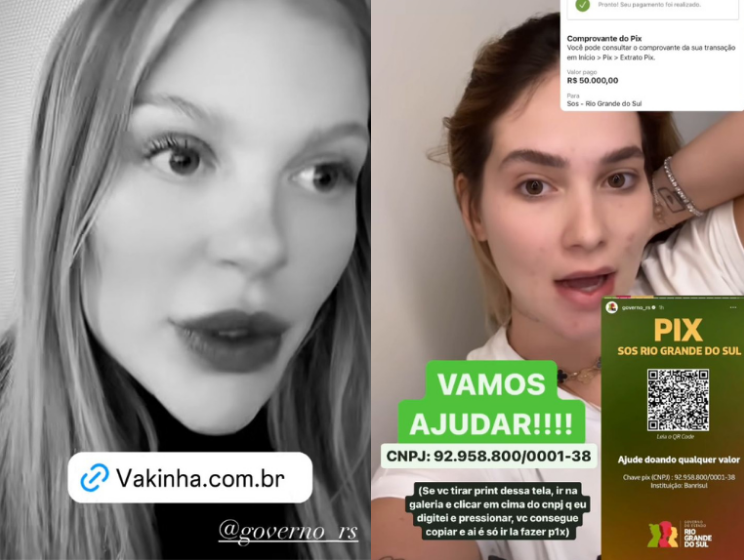 Luisa Sonza, natural do estado, compartilhou um vídeo e lamentou: “Gente a situação do meu estado, Rio Grande do Sul, está bem triste e complicada. Eles estão vivendo a maior catástrofe da história e precisam de nós. Toda ajuda é bem-vinda!”, ela deixa formas de doação e incentiva os fãs a compartilharem.