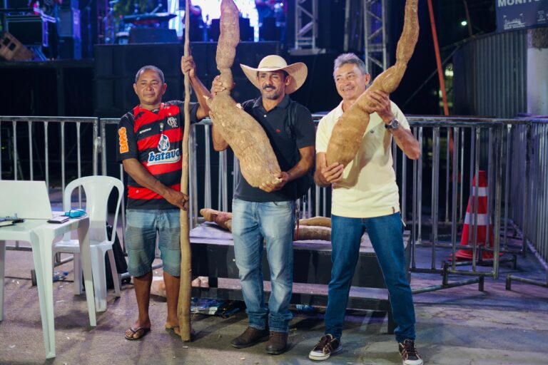 O outro critério da premiação seria o cumprimento da raiz da mandioca e o terceiro seria para desempate caso tivesse macaxeiras do mesmo tamanho, o que não aconteceu no concurso, por isso o critério para definir o vendedor será o tamanho da macaxeira.