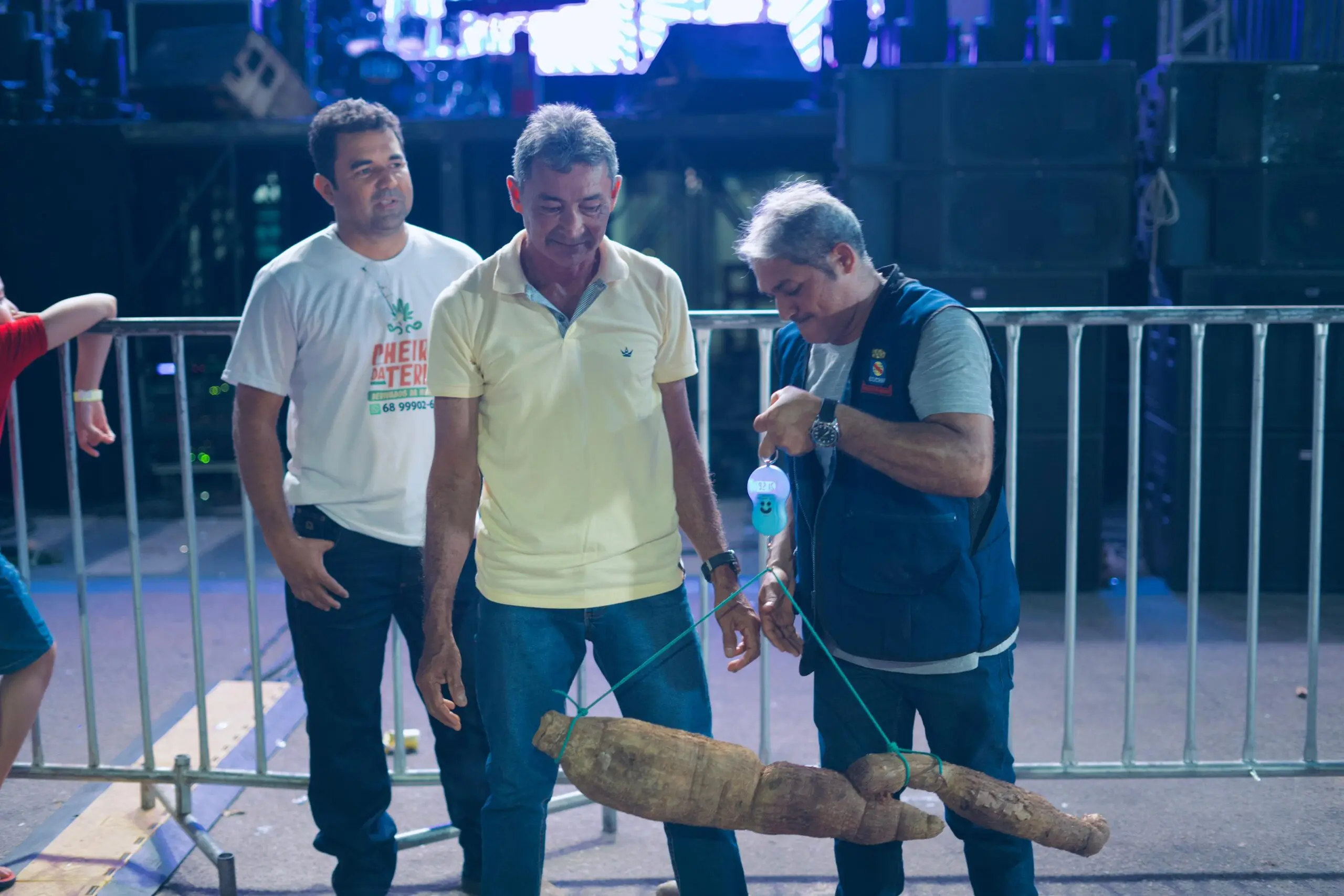 Participantes exibem orgulhosamente suas macaxeiras durante o concurso da maior macaxeira de Rio Branco/Foto: Yago Ayache/ContilNet
