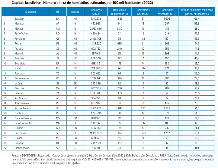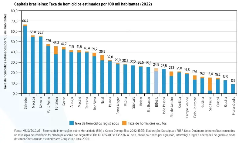 No geral, nas capitais brasileiras, as taxas de homicídios estimados em 2022 variaram entre 8,9 e 66,4 mortes por 100 mil habitantes.