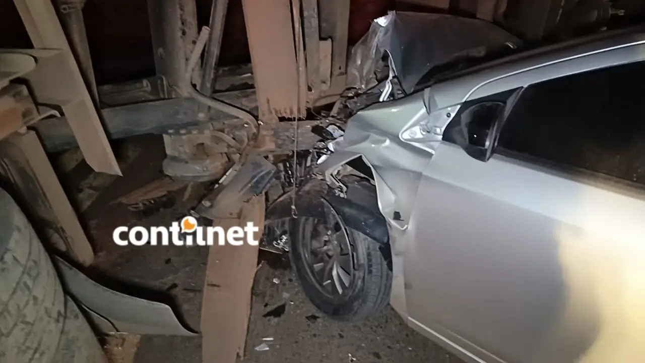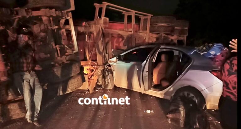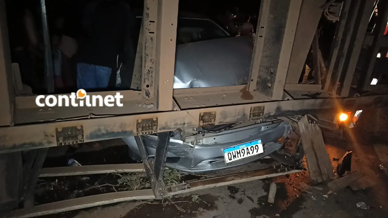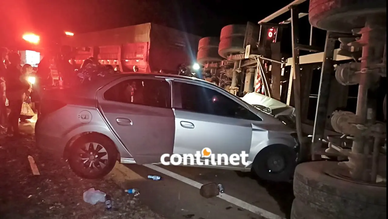 Durante o movimento brusco, o motorista conseguiu controlar a parte da frente da carreta, mas a parte traseira tombou cruzando toda a pista, justamente no momento em que um carro modelo Onix, de cor prata e placa QWM-9A99, que trafegava no sentido contrário, passava com quatro pessoas e colidiu com a carreta.