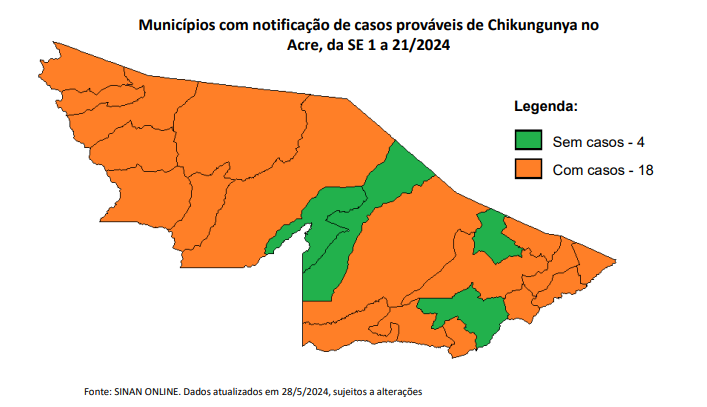 Segundo os dados, não há óbito pela doença, mas 18 dos 22 municípios do Acre já registraram casos de chikungunya este ano. Apenas Santa Rosa do Purus, Manoel Urbano, Bujari e Capixaba não registraram casos da doença.