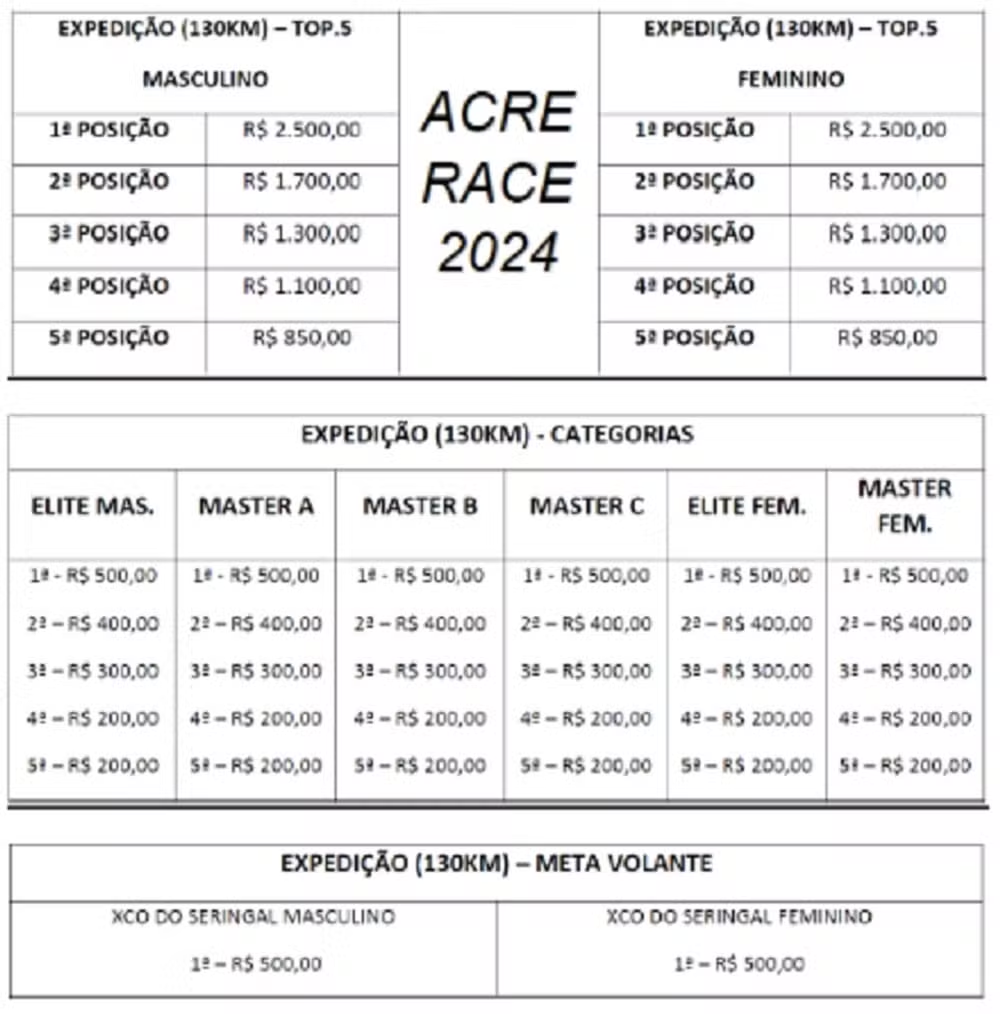 Os prêmios são divididos entre as categorias e trajetos diferentes, sendo as divisões as seguintes: Elite Masculino, Master A, Master B, Master C, Elite Feminino e Master Feminino. Os trajetos possíveis a serem realizados são o Expedição, com 130 quilômetro e o Aventura, com 85. No primeiro deles, os cinco primeiros colocados serão premiados, enquanto no segundo, a bonificação irá até a terceira colocação.