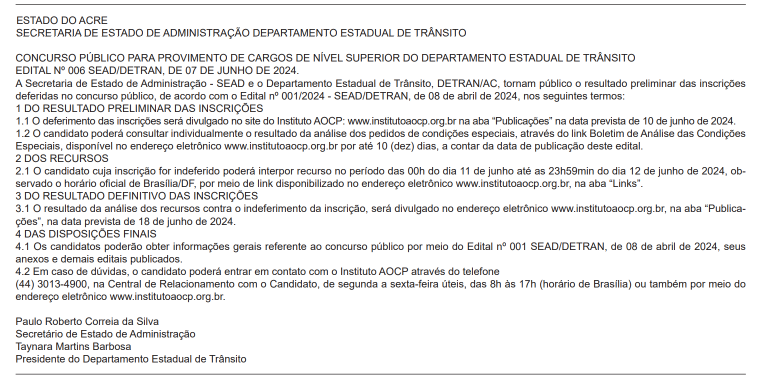 Os deferimentos estarão disponíveis através do site do instituto que está organizando o processo seletivo ( www.institutoaocp.org.br), dentro da aba “publicações”.