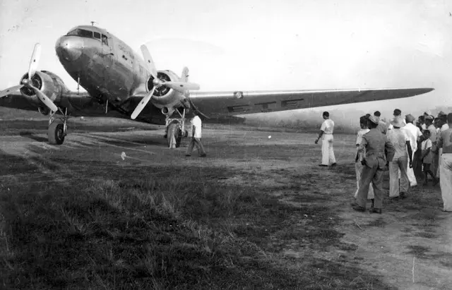 Moradores de Rio Branco aguardam momento do desembarque no aeroporto da capital; avião Douglas DC-3, de prefixo PP-ETE, pertencia ao governo do Território Federal do Acre/Foto: Domínio Público