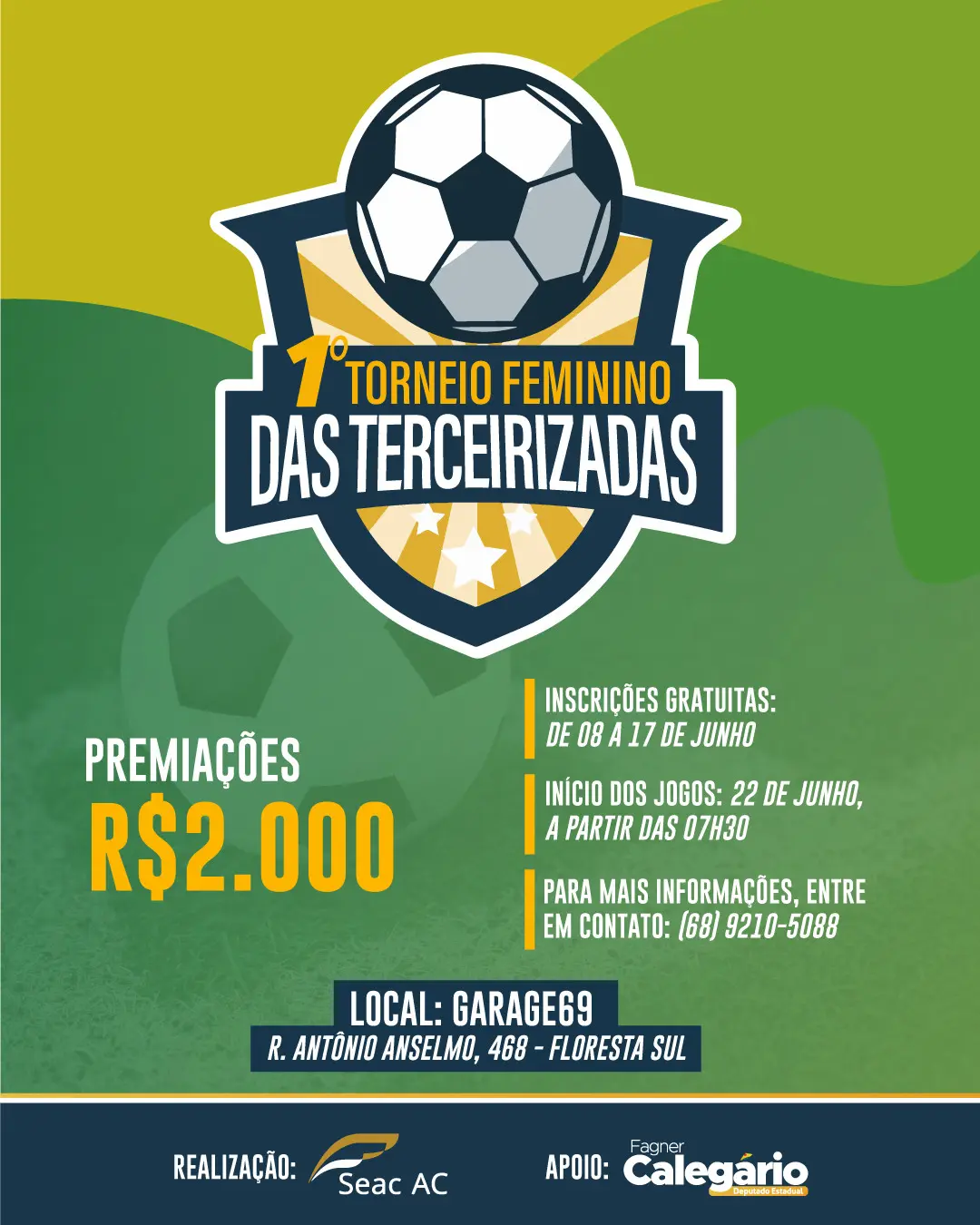 As inscrições estão abertas até o dia 17 de junho. Para se inscrever ou obter mais informações, as interessadas devem entrar em contato com seus encarregados ou ligar para o número (68) 99210-5088.