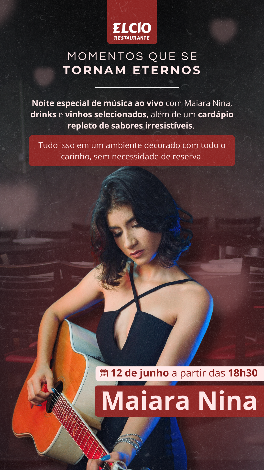 No Elcio Restaurante, momentos se tornarão eternos com uma noite especial de música ao vivo com a cantora Maiara Nina com vinhos e bebidas selecionados. Além de uma decoração dedicada ao tema.