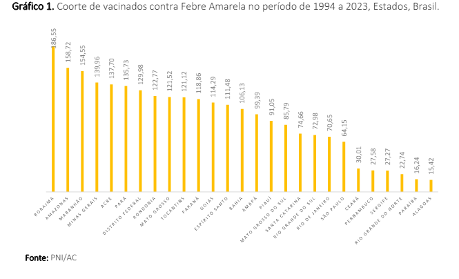 O estado já administrou ao longo desse período 1.244.456 doses da vacina contra Febre Amarela. Apesar da localização no ranking, o Acre nunca alcançou a meta prevista da cobertura, que é de 90%, chegando ao máximo de cobertura de 68,69%.