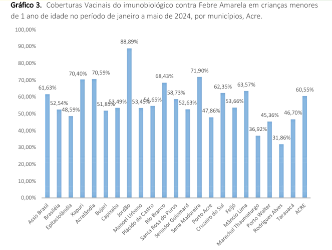 Já em 2024, de janeiro a maio, a cobertura vacinal do estado está em pouco mais de 60%. Os municípios com dados mais altos foram Jordão (88,89%), Sena Madureira (71,90%) Acrelândia (70,59%) e Xapuri (70,40%). Todos os outros municípios apresentam coberturas abaixo de 70%, sendo os mais baixos: Rodrigues Alves (31,86%) e Marechal Thaumaturgo (36,92%).