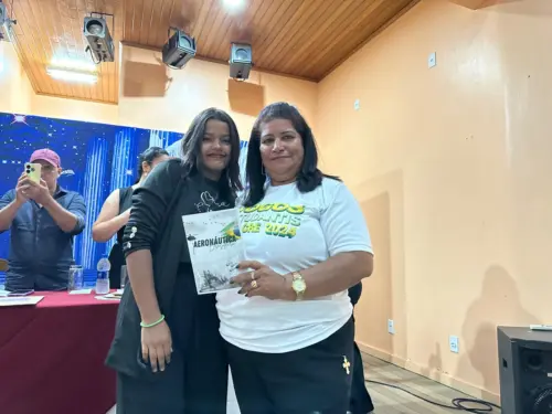 A estudante do 3° G, a cadeirante Isabelly Lima de Souza, foi homenageada pelo trabalho de arte “Os itinerários para uma carreira militar – História da Aeronáutica”. Isabelly recebe atendimento pedagógico domiciliar devido à sua condição de saúde física, e para participar da atividade contou com o apoio constante da mãe, Raimunda Nonata Silva de Lima, e da professora de Atendimento Pedagógico Domiciliar (APD), Vanderleya Oliveira Freire.