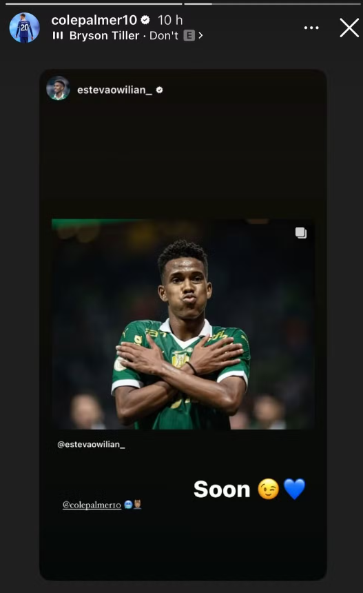 Estêvão só chegará ao Chelsea em 2025, mas antes mesmo da transferência têm se conectado com outros atletas do time nas redes sociais – os seguiu e foi seguido de volta. É o caso do lateral-direito Reece James, do zagueiro Trevoh Chalobah e do meio-campista Michael Golding, além do próprio Cole Palmer.