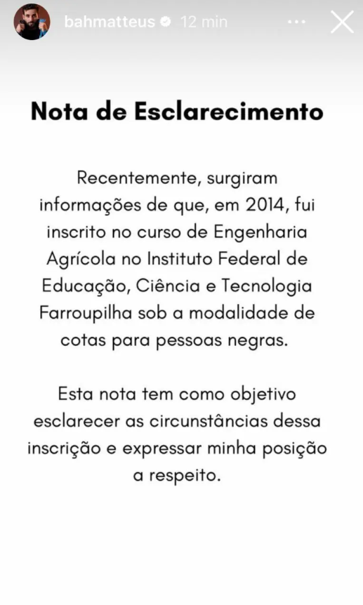 Matteus Amaral se manifestou sobre as acusações de fraude no sistema de cotas nesta sexta-feira (14), em resposta ao comunicado do Instituto Federal Farroupilha. Segundo a instituição, Matteus teria ingressado na faculdade em 2014 ao se autodeclarar preto, conforme permitido pela Lei de Cotas da época, que exigia apenas a declaração do próprio aluno como prova de etnia.