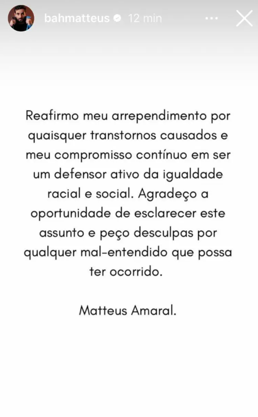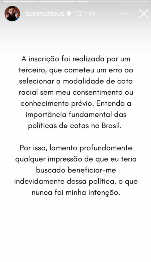“Por isso, lamento profundamente qualquer impressão de que eu teria buscado beneficiar-me indevidamente dessa política, o que nunca foi minha intenção”, afirmou Matteus. Ele enfatizou seu arrependimento pelos transtornos causados e reafirmou seu compromisso contínuo em ser um defensor ativo da igualdade racial e social. “Agradeço a oportunidade de esclarecer este assunto e peço desculpas por qualquer mal-entendido que possa ter ocorrido”, concluiu.