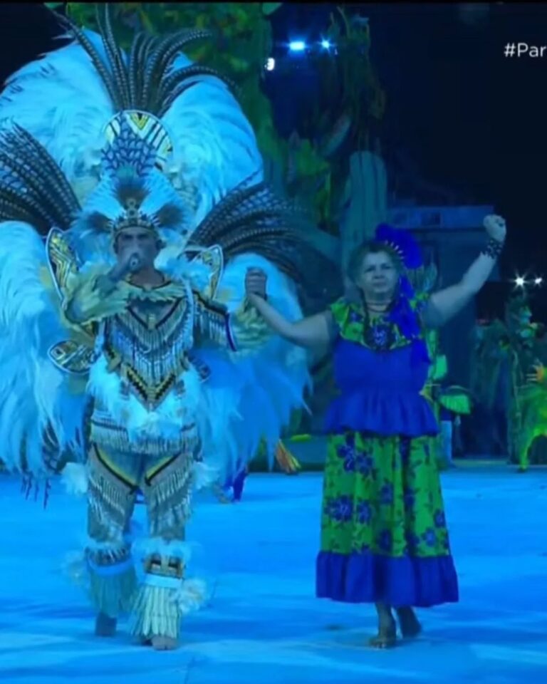 Equipe do Festival Folclórico de Parintins, incluindo líderes indígenas e ambientalistas, em emocionante espetáculo/Foto: Reprodução