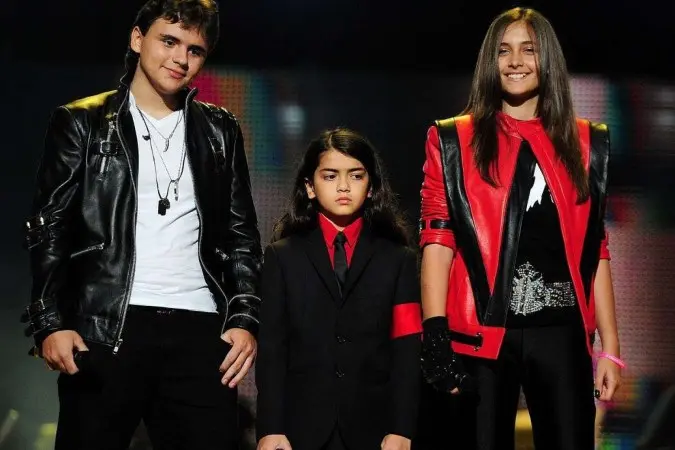 Na image, os filhos de Michael Jackson, Prince Jackson (E), Blanket Jackson (C) e Paris Jackson (D) em 2011 durante show em homenagem ao pai – (crédito: LEON NEAL/AFP)