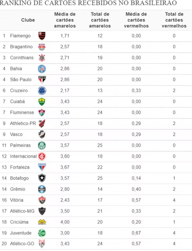 Líder da classificação do campeonato, o Flamengo também tem os jogadores menos punidos com cartões no Brasileirão. Foram 12 cartões amarelos e nenhum vermelho, mesmo tendo disputado sete partidas, assim como Bragantino e Corinthians, segundo e terceiro colocados, respectivamente, no ranking de atletas menos punidos. O Atlético-GO é o time mais punido com cartões. Atlético-PR e Corinthians se enfrentam nesta quinta-feira.