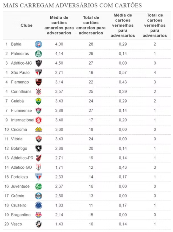 Vice-líder do Brasileirão após sete jogos, está sendo difícil parar o Bahia. Os adversários estão apelando, e a equipe é a que mais carrega adversários com cartões neste início de competição. Adversários receberam em média 4,0 amarelos e 0,29 vermelhos por partida ao enfrentarem o Galo (ou 28 cartões amarelos e dois vermelhos em sete jogos). Foi contra o Vasco que os adversários menos receberam cartões nas sete primeiras rodadas.