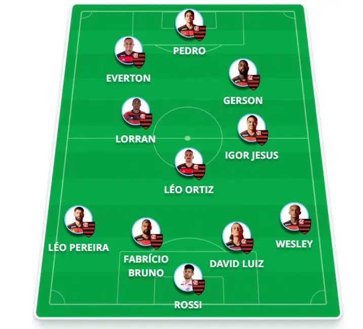 Provável time: Rossi, Wesley, Fabrício Bruno, David Luiz e Léo Pereira; Léo Ortiz, Igor Jesus e Lorran; Gerson, Everton Cebolinha e Pedro.